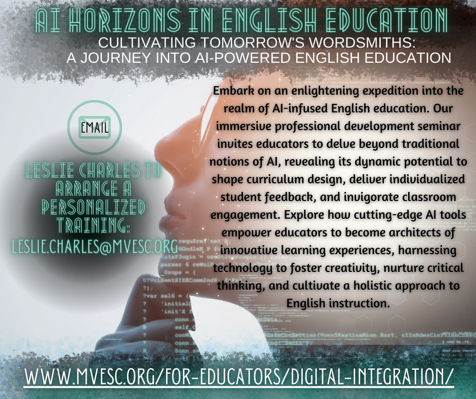 Please visit our EduTrack Professional Development online learning link for a complete listing of topics currently available. If you are interested in specific technology topic or professional development training, please contact Leslie Charles the MVESC Digital Integration Coordinator and Technology Integration Coach for more information.